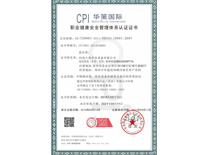 職業(yè)健康安全管理體系認證證書