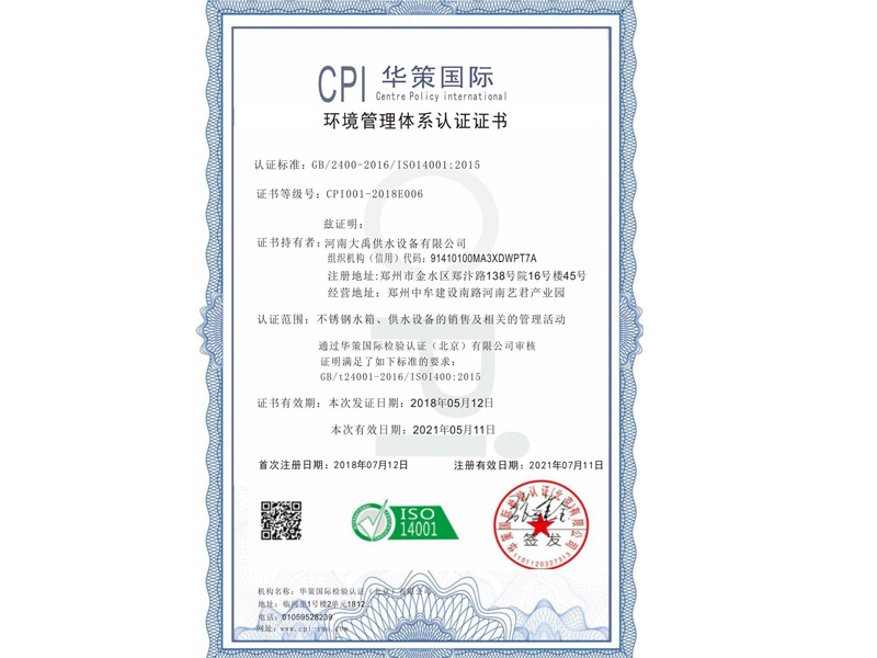 環(huán)境管理體系認證證書